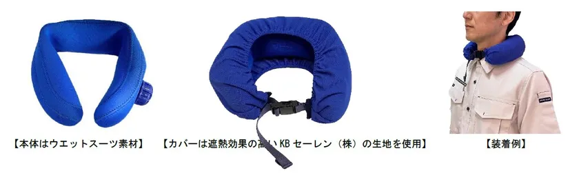 水道水を利用して何度でも使えるネッククーラーです。本体素材にウェットスーツ素材を使用することで、柔らかくサラッとした感覚で肌の馴染みも良好です。カバーには遮熱効果の高い生地を使用し、本体の冷却効果の持続化に貢献しています。工事現場やスポーツ観戦に最適な夏の新定番商品です。