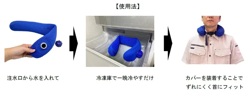 丸中は、実際に使用する場面を想定し、より使いやすくなるよう、カバーに遮熱効果の高い素材と、首に巻く装着時に手元が見えなくなって装着しづらくなるのを防ぐ磁石入りの接続パーツなどを見つけ出し、カバーの完成にこぎ着きました。本体も首の周囲を包み込むように形状を改良し、首周りの冷却効果を高める工夫を行いました。販売に向けて、まずは工事関係者など屋外で作業をする方々を主に想定しました。