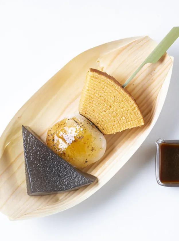 一緒についてくるのは田楽味噌に見立てた、黒みつキャラメルソース。