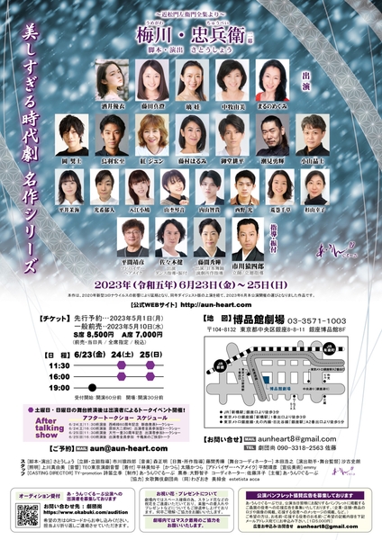 2020年5月新型コロナの影響により中止、同年「アートにエールを!」ダイジェスト版の上演を経て、今回、脚本・キャストを一新し、満を持しての本公演です。梅川・忠兵衛は大竹一重と宮原奨伍。特別ゲストの横内 正、原田大二郎、三浦浩一を中心に、イケメン若手俳優やレギュラー女優陣が二人を華やかに盛り上げます。恋の逃避行をする二人の幻想的な場面や廓の女たちの粋で艶やかな衣裳の数々、激しく華麗な立回り、新感覚の「美しすぎる時代劇」あ・うん♡ぐるーぷならではの「梅川忠兵衛」をお楽しみください。