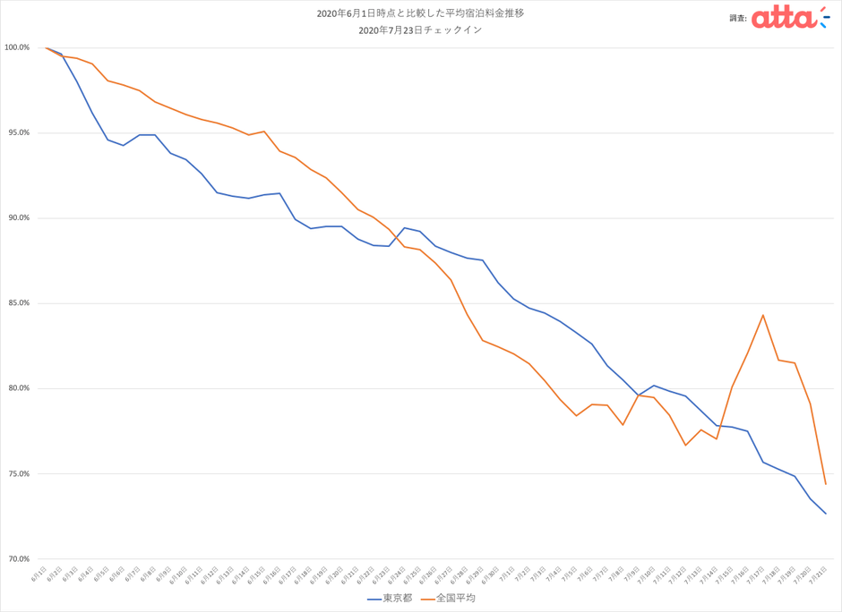 2020年7月23日チェックインの宿泊に対して、2020年6月1日時点と比較した東京都と全国の平均宿泊料金推移
