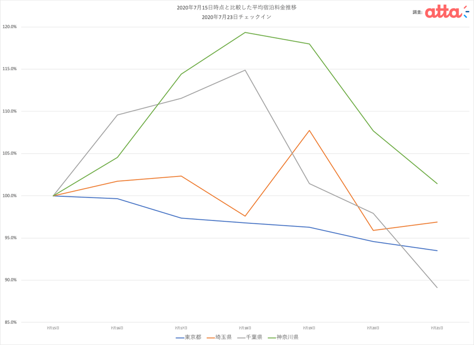 ビッグデータとAIを使った「お得予報型」旅行検索サービス「atta(あった)」(https://atta.ai)を運営する、株式会社atta (本社:東京都荒川区、代表取締役社長:春山佳久)は、Go Toトラベルキャンペーン最初の4連休初日にあたる2020年7月23日の宿泊料金トレンドに関して調査を行いました。宿泊料金トレンドにて宿泊予約の需要が把握することができます。