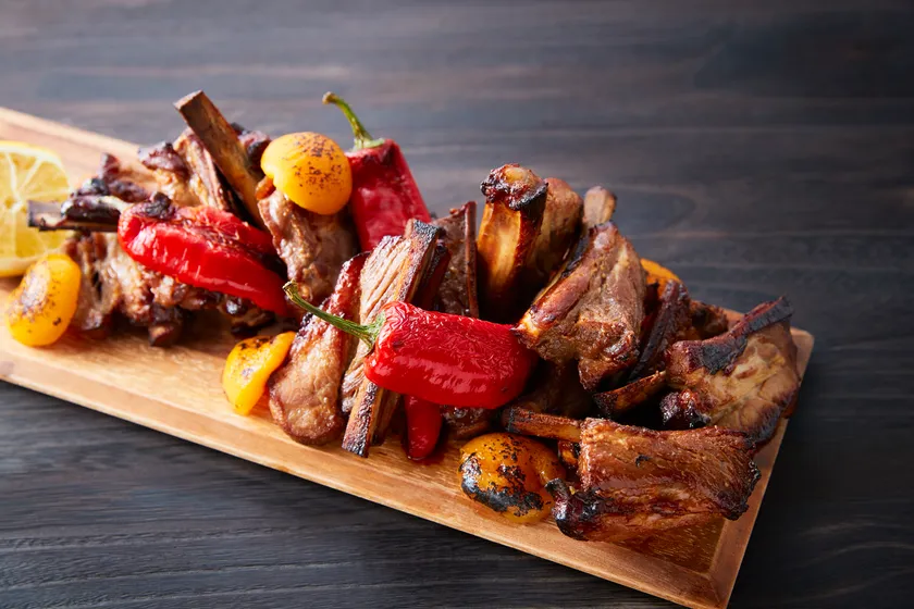 甘辛い味付けでこってりと仕上げた骨付き肉。肉とタレの艶やかな照りに、カラフルな焼き野菜を添えて。