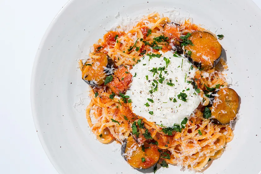 豊富に揃うメニューの中でも生モッツァレラチーズと「農家のベーコン」、茄子のトマトソース(1,180円)は、最初は生モッツァレラチーズのフレッシュさと生パスタの相性を楽しんで頂き、あとは混ぜて召し上がって頂くとトマトクリームソースのような味になり2度楽しめる人気のメニュー。
