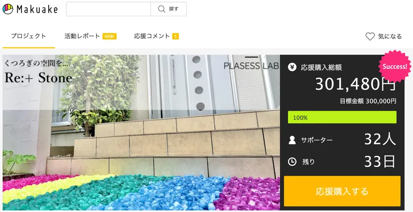 2020年7月4日(土)よりクラウドファンディングサイトMakuakeにて開始した、『24色の防犯砂利であなたの思い描いたお庭を実現 ~防犯砂利でギネスブック挑戦~』のプロジェクトが、終了日の2020年8月30日(日)まで残り日数30日で、早くも目標金額の100%のご支援を達成したことをご報告いたします。