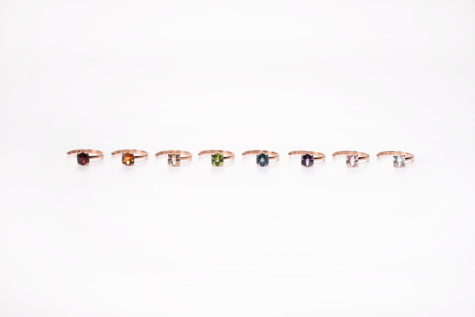 コンセプトにもとづいて、選んだ2色のカラーストーンリングを重ね付けした時、最も美しく指元を飾ります。