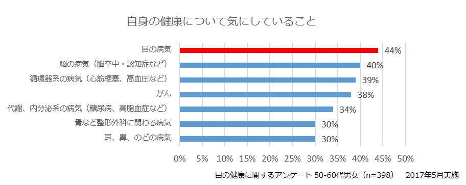 2017年に実施した調査によるとシニアは自身の健康について「目の健康」を最も意識していることがわかりました。近年では、紫外線量の増加、外出自粛期間のテレワークやTV視聴時間の増加でブルーライトを日常的に浴びてしまう環境下で過ごすシニアも多く見られ、ニューノーマルな時代において、生活様式に合ったアイケアがより重要になってきております。