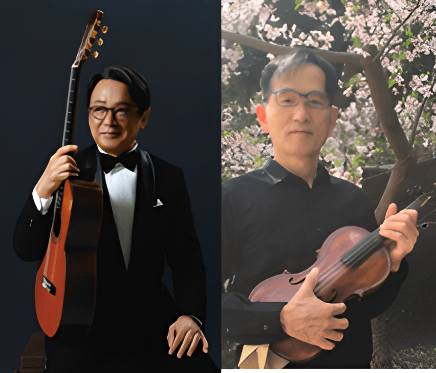 豪華客船「飛鳥II」専属ギタリストとして活躍中の岡野雅一と、イタリアでのヴァイオリン修行経験をもつヴァイオリン奏者、長野充による共演。