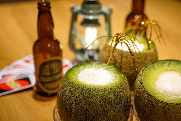 夏に旬を迎えるメロンの種をくり抜き、まるごと凍らせたものをビールのジョッキとして提供いたします。ビールをメロンジョッキに注ぐと、メロンの甘さと風味が楽しめる「メロンまるごとビール」が完成!メロンで乾杯をするシーンは、写真映えすること間違いなしです。ビールを楽しんだ後は、メロン用のスプーンで甘い果肉も楽しむことができるので、茨城県ならではの夏をこの一品で堪能できちゃいます!