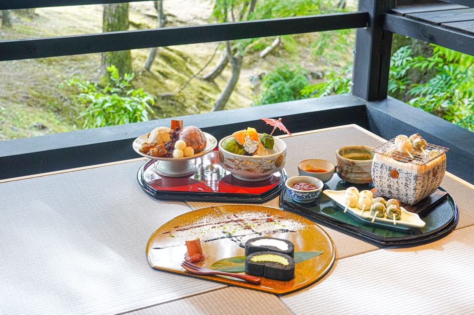 店内には京都出身の壁画絵師・木村英輝氏が手掛けたアートな襖絵や北欧アンティーク家具を配置。四季折々の表情を覗かせる庭園を眺めながらスイーツをご堪能いただけます。