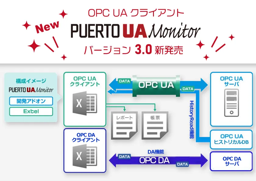 株式会社ベルチャイルド(本社:大阪市北区、代表取締役:藤田 好邦、以下 ベルチャイルド)と株式会社プエルト(本社:東京都町田市、代表取締役:本田 寿明、以下 プエルト)は、Industry4.0推奨通信プロトコルであるOPC UA通信をExcel(R)上で手軽に活用できるOPC UAクライアントソフト「PUERTO UA Monitor(以下、UA Monitor)」の新バージョンを2020年9月1日より提供します。