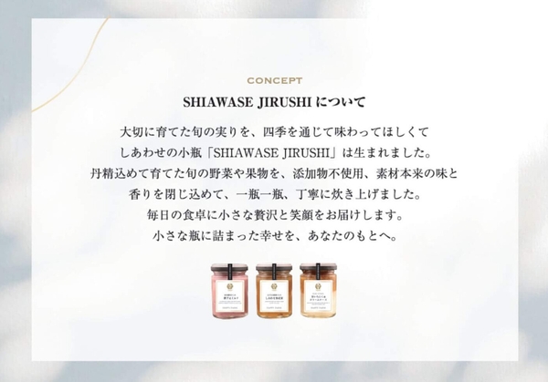 大切に育てた旬の実りを、四季を通じて味わってほしくて、しあわせの小瓶「SHIAWASE JIRUSHI」は生まれました。 丹精込めて育てた旬の野菜や果物を、添加物不使用、素材本来の味と香りを閉じ込めて、一瓶一瓶、丁寧に炊き上げました。 毎日の食卓に小さな贅沢と笑顔をお届けします。 小さな瓶に詰まった幸せを、あなたのもとへ。