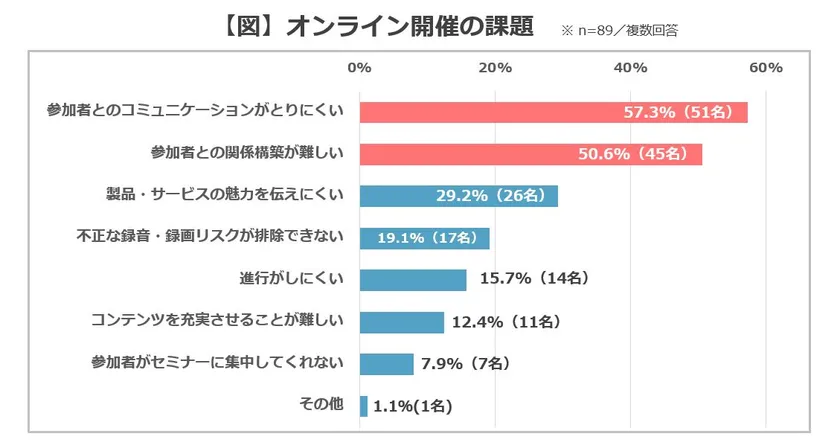 質問2で、オンライン化したセミナーの一部または全部を対面での開催に戻すと回答した方に、対面開催に戻す背景にあるオンライン開催の課題について調査を行い、以下の結果を得ました。