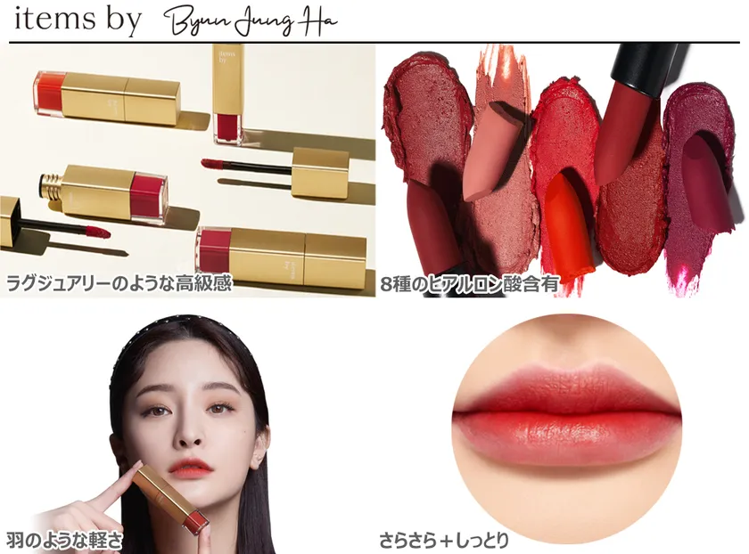 items by Byun Jung Haのリップスティックとリキッドリップスティックは、モデルとして活動しているビョン・ジョンハさんのトレンディなスタイルを基に、彼女が直接製品のカラーとテクスチャーのプロデュースに手掛けております。