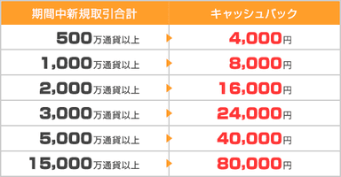 『選べる外貨』でのお取引で、期間中に以下の取引条件を達成されたお客様にキャッシュバックいたします。