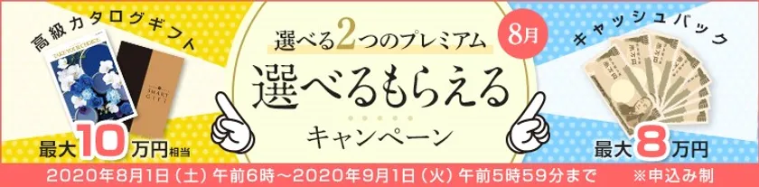 GMOインターネットグループのGMOフィナンシャルホールディングス株式会社の連結会社で、金融商品取引業を営む株式会社FXプライムbyGMO(代表取締役社長 安田和敏、以下 FXプライムbyGMO)は、2020年8月1日(土)より「選べるもらえるキャンペーン」、高級カタログギフト(最大10万円相当)かキャッシュバック(最大8万円)か、受け取り方法が選べるキャンペーンを開始いたしました。
