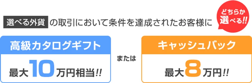 本キャンペーンでは、キャンペーン期間中における外国為替保証金取引(FX)『選べる外貨』での新規取引数量に応じて、最大100,000円相当の高級カタログギフト、『テイク・ユア・チョイス』・『スマートギフト』、もしくは、最大80,000円のキャッシュバックをプレゼントいたします。受け取り方法が選択できるため、ギフトをご希望の方も、キャッシュバックをご希望の方も、どちらのお客様にもご満足いただけるキャンペーンです。