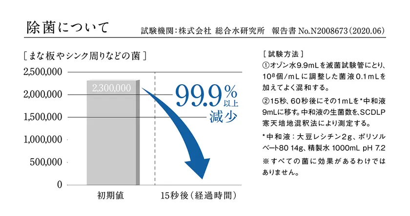 オゾン濃度 :初期濃度:1.0mg/L以上、有効時間中:0.5mg/L以上