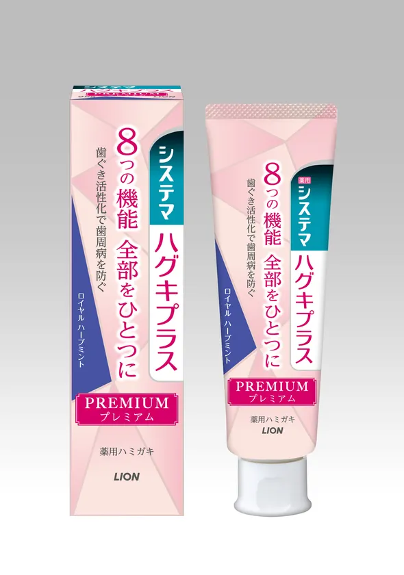 そこでこの度、1本のハミガキに8つの機能を持たせたプレミアム処方の薬用ハミガキ『システマ ハグキプラス プレミアム ハミガキ ロイヤル ハーブミント』を追加新発売いたします。