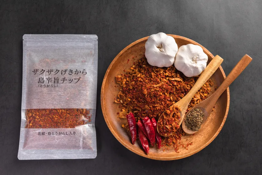 「島辛旨チップ」は、数種類の中華スパイスと、オニオン・ガーリック・エシャロットやアーモンドをブレンドし、完成した料理に振りかけて、辛さ・旨さ・食感を楽しんでいただけるスパイスです。『げきから』には沖縄県産の島とうがらしを使用しております。