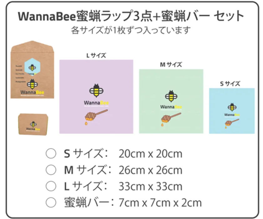 プロジェクトの支援プランでは、WannaBee蜜蝋ラップ3枚(S、M、Lサイズ)+蜜蝋ワックスバーの4点を1セットとし、1セット、3セット、さらに料理教室などでもご利用いただける5セット、10セットからお選びいただけます。