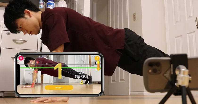 「家トレ」で腕立て伏せを行う様子。AIで骨格位置をビジュアル表示します。
