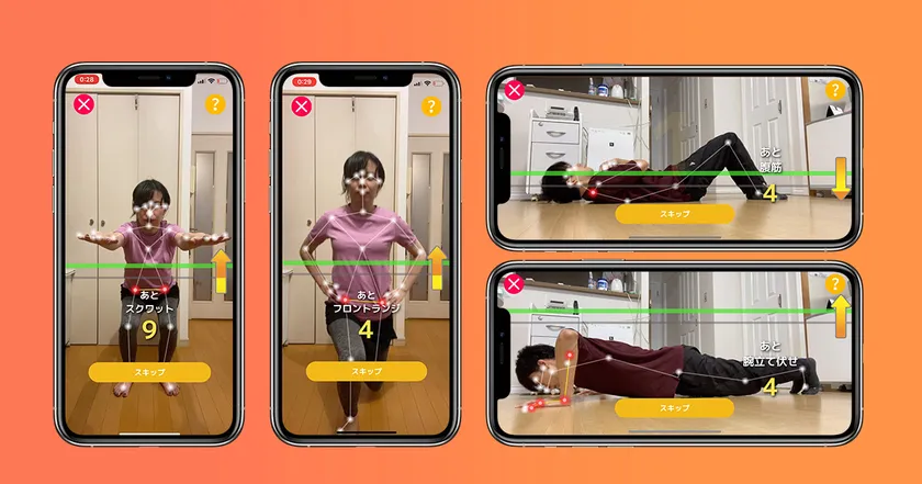 「家トレ」は独自開発のAI姿勢推定エンジンを用いて人間の骨格位置を自動認識することでトレーニング回数を自動的にカウントできるAIモーションカウンターアプリです。アプリを起動しスマートフォンやタブレットのカメラに全身を写した状態で反復トレーニングをするだけで自動カウントが行われます。