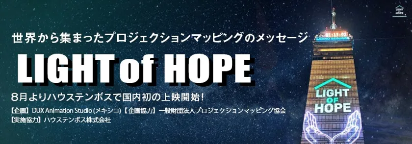 一般財団法人プロジェクションマッピング協会(以下 PMAJ/東京都渋谷区)は、ハウステンボス株式会社(長崎県佐世保市)とともに、コロナ禍に世界各地で始まったプロジェクションマッピングのメッセージ上映をハウステンボスで2020年8月1日(土)より実施することが決定いたしました。PMAJは、メキシコで【LIGHT of HOPE(希望の光)】を実施運営した映像制作プロダクションのDUX Animation Studio(メキシコ)と連携を取り、日本での上映実施に向けて企画を進めて参りましたが、この度、ハウステンボスの全面的な協力により、実現することが出来ました。