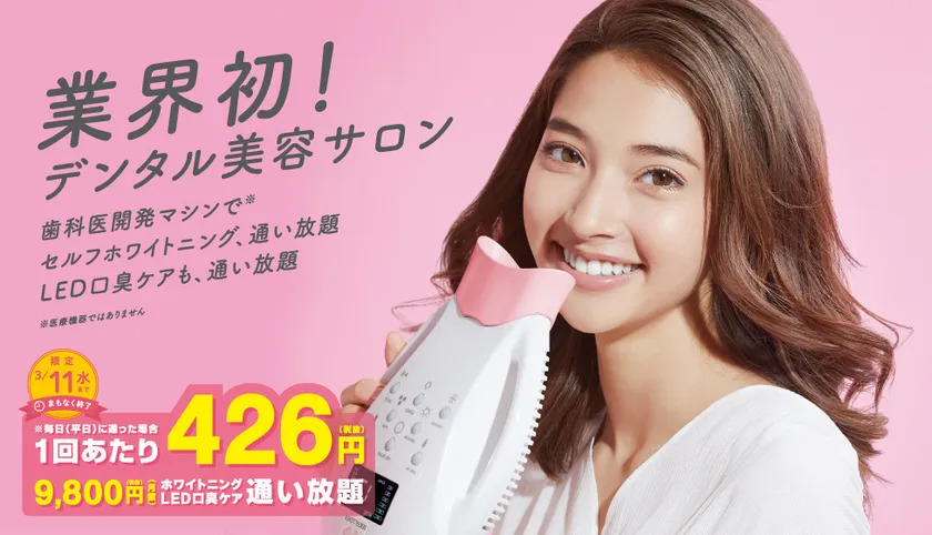 歯科医考案!日本初業態のセルフ式デンタル美容サロン 「デンタルラバー」でホワイトニングとLED口臭ケアが 月額たったの9,800円で通い放題!1回なんと426円※ ※価格はすべて税抜き ※1ケ月間休まず通いきった場合の単価です