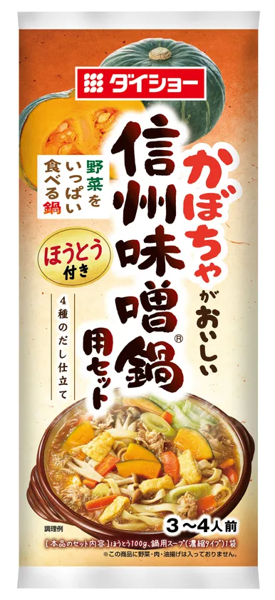 『野菜をいっぱい食べる鍋 信州味噌(R)鍋用セット』は、味噌ベースのスープに4種類のだし(カツオ・鶏がら・昆布・煮干し)を効かせ、コク深く仕上げた濃縮タイプの「鍋用スープ」と、凹凸をつけた手揉み風の「麺(ほうとう)」が入った鍋用セットです。付属の平打ち麺と、カボチャ、ニンジン、白菜、長ネギ、シメジなどの野菜や油揚げ、豚うす切り肉と一緒に煮込むだけで“山梨名物”が簡単に作れます。カボチャを崩し、煮溶かしながら食べれば、スープにとろみが出て、甘みも一層広がります。また、緑黄色野菜の目標摂取量1日分の1/2~2/3を摂ることができます。