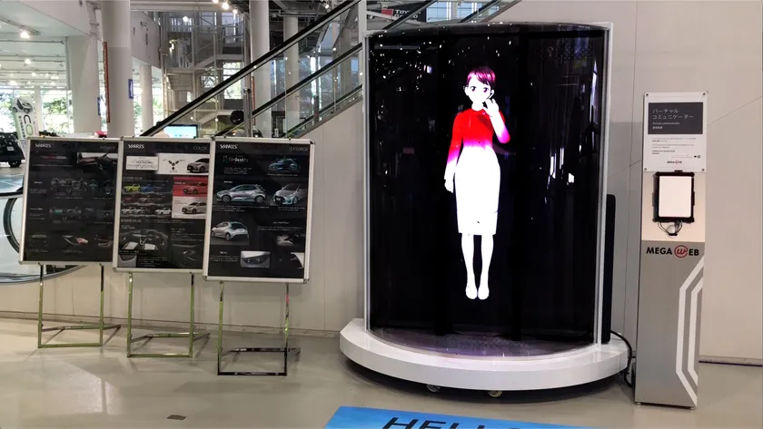 3Dサイネージは高さ2メートルで可動式。サイネージに登場する実寸に近いバーチャルコミュニケーター(AIアンドロイド型女性)が、多言語により様々な車種を紹介します。