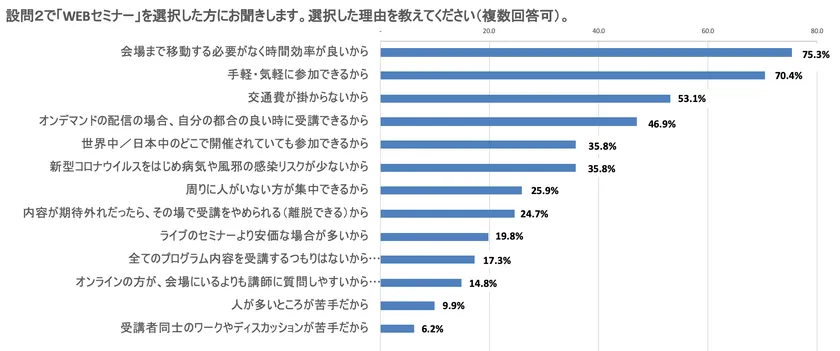「WEBセミナーを選択する」と回答した人にその理由をたずねてみると、「会場まで移動する必要がなく時間効率が良いから」が75.3%で最も多く、2番目に「手軽・気軽に参加できるから」70.4%、3番目に「交通費がかからないから」53.1%と続きました。「新型コロナウイルスをはじめ病気や風邪の感染リスクが少ないから」という新型コロナウイルスの感染対策を直接的な理由を選択した人は35.8%と5番目にとどまりました(グラフ2参照)。