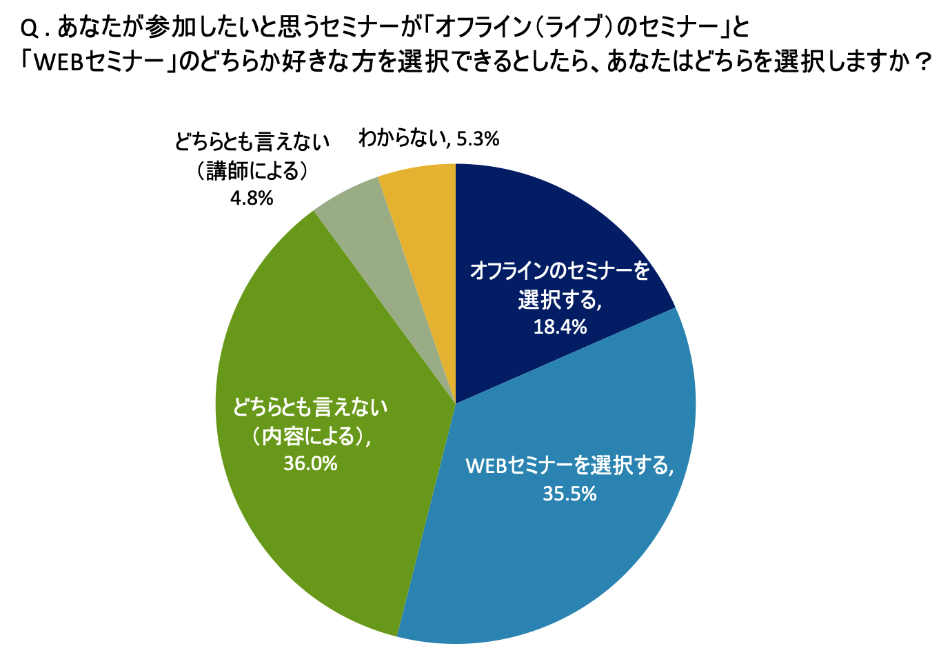 『あなたが参加したいと思うセミナーが「オフラインのセミナー」と「WEBセミナー」のどちらか好きな方を選択できるとしたら、あなたはどちらを選択しますか?』の問いに対して、「オフラインのセミナーを選択する」と回答した人が全体の18.4%だったのに対し、「WEBセミナーを選択する」と回答した人は35.5%にのぼり、その数はオフラインを希望する人の約2倍だったことがわかりました(グラフ1参照)。