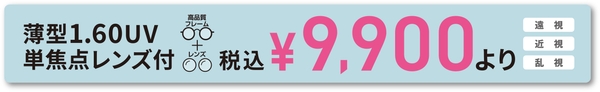 うす型1.60UV単焦点レンズが付いて、メガネ一組 税込¥9,900より