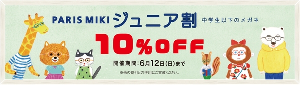新年度がスタートし、新しい学校生活が始まる子どもたちをサポートする「パリミキ ジュニア割」キャンペーン。中学生までのお子さまを対象に、メガネ1組お買い上げの際、レジにて10%OFF!