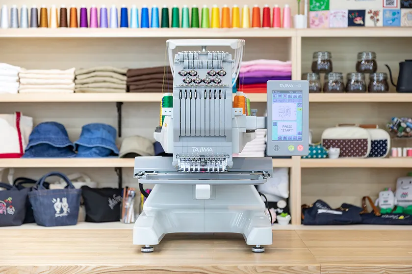 体験工房に導入される「TAJIMA SAI -彩-」は、そんなTAJIMAの技術とノウハウを詰め込んだコンパクト刺しゅうミシン。コンパクトな形状で低価格帯のミシンながら、プロレベルの綺麗な刺しゅうを速く安定して提供します。