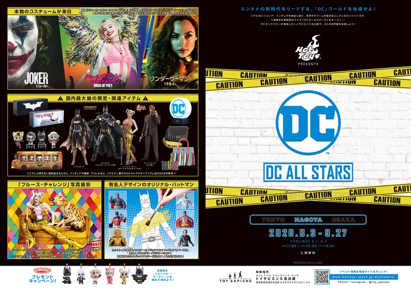 映画『ジョーカー』や『ハーレイ・クインの華麗なる覚醒 BIRDS OF PREY』、そして10月9日に日本公開が決定した、2020年最大級のスケールで放つアクション・エンターテイメント『ワンダーウーマン 1984』などの話題の映画で、エンターテインメントの新時代をリードする存在となった「DC」の世界観を存分に体感していただけるよう「トイサピエンス」をまるごとメガストア化。魅力的なアトラクションやバラエティ豊かな販売アイテムを取り揃えております。