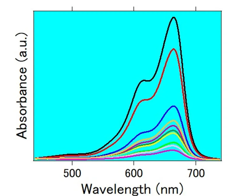 MOFの光触媒材料によるメチレンブルー色素の経時的分解を表す吸収スペクトル