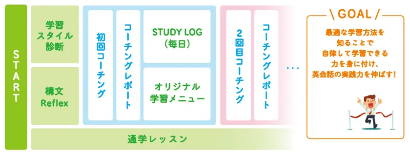 このプログラムの特徴は、英会話の上達に特化したサービスであること、また内発的動機付けのコーチングであることです。一般的に、“英語検定試験の目標点獲得のためには何時間学習しなくてはならないという外発的動機づけはモチベーションの継続に課題がある”と言われます。そのため気質診断による受講者の性格に合わせたアドバイスや、ライフスタイルに合わせて学習時間設定を提示するなど、長期的視座に立った学習プランを提示します。