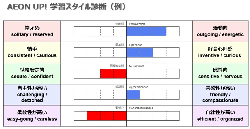 学習スタイル診断は、IGS株式会社のサービス「Ai-Grow」を利用します。いくつかの質問に回答することで、学習に取り組む姿勢や性格が分かります。生徒とコーチのお互いが生徒自身の傾向を理解し、一人一人の傾向に合わせて無理のない学習方法を提案するのに役立てます。