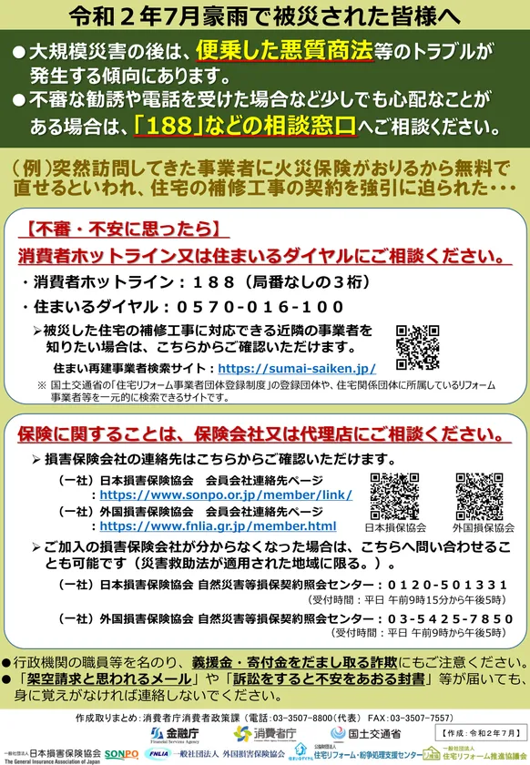 一般社団法人 日本損害保険協会(会長:広瀬 伸一)では、消費者庁と連携して「令和2年7月豪雨で被災された皆様へ」と題した注意喚起のチラシ(A4両面)を作成しました。