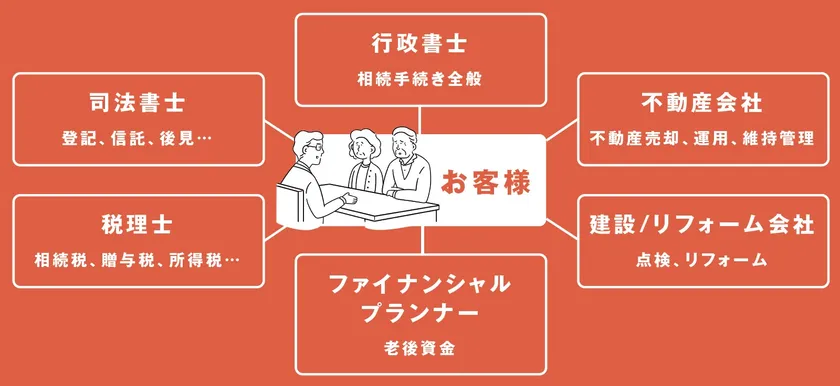 不動産会社には、名義変更を行う司法書士など、パートナー関係にある専門家がいますが、相続に詳しい専門家は一握りです。当社は、姉妹サービスの「いい相続」で培った行政書士、司法書士、税理士、ファイナンシャルプランナー(FP)といった独自のネットワークを活かし、不動産相続後の相続税や後見人制度など、より広範囲でお客様をサポートすることが可能です。
