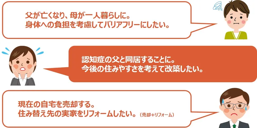 相続した不動産に住み続ける場合、お金以外にもさまざまな不安が立ちはだかります。ご相談の中には、よりよい今後の生活のために、「将来のことを見据えてバリアフリーにしたい」、「古くなった設備を見直したい」などのお声もあります。そういったご要望にお答えするために、まずは不動産の無料点検をします。リフォームでは「いい不動産」が複数社から見積を取得し、信頼できる事業者をご紹介します。