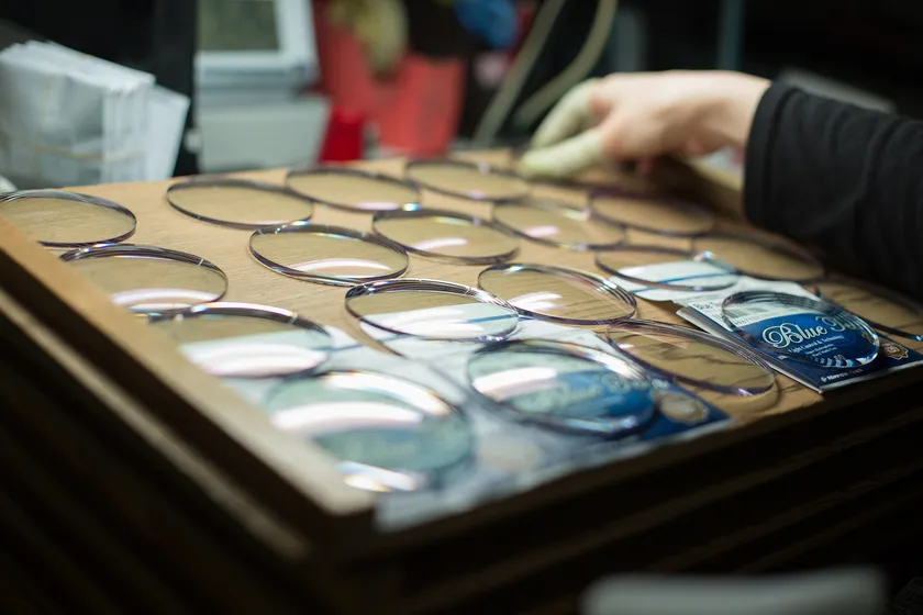 大量生産への道を選ばず、最高の品質を追究し続けた結果、現在も職人が一枚ずつ、使う人に合ったメガネレンズを手作りしています。