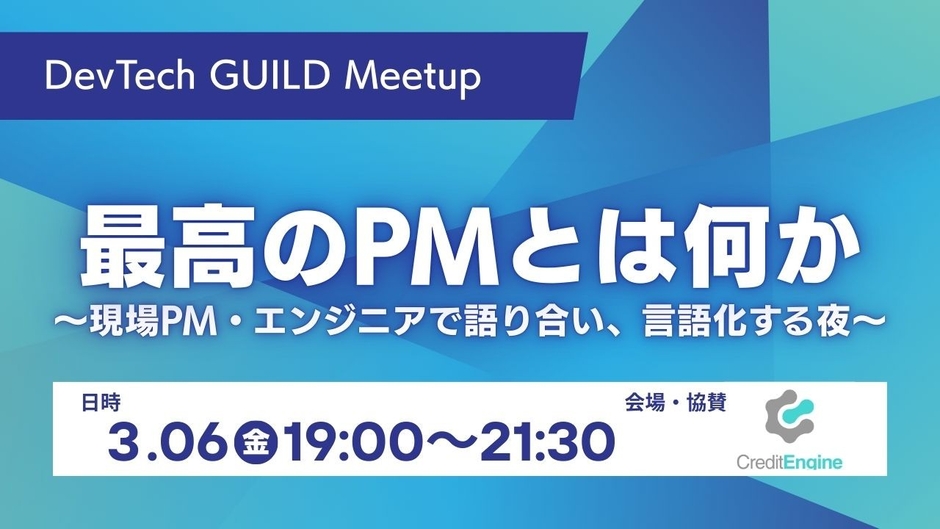 本イベントは、PM・PM志望のエンジニアに特化したギルド型コミュニティ「DevTech GUILD」による第1回イベントであり、クレジットエンジン株式会社の協賛のもと実施されます。