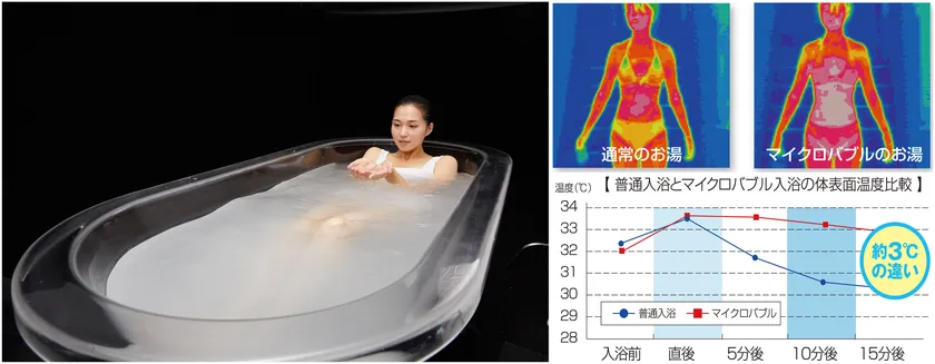 水と空気でできた0.003mmの超微細な気泡が、ミルクのようなお湯を創り、肌のすみずみまでの汚れや、毛穴の奥の老廃物などに付着して浮かび上がらせるほか、気になるニオイの元も洗い流します。また、超微細な気泡がほどよい刺激を与えてくれるので、身体の芯から温まります。