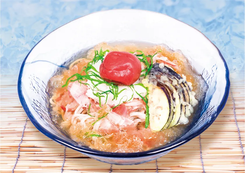毎日お店で仕込みをし1週間寝かせて注ぎ足しながら使用する秘伝の「かえし」、信州から取り寄せる本場の生蕎麦と、国産小麦で打ったツルッとコシの強い最近メディアでも注目の武蔵野うどんが自慢の<お多福>。化学調味料は一切使わず、羅臼昆布からとった出汁に鰹節などの色々な削り節を配合してコクのある出汁になっています。その出汁を、猛暑でもより美味しく召し上がっていただくために、凍らせた出汁と、最高級ブランドで老舗の中峰農園紀州南高梅を使用、大葉、茄子の天ぷらをつけた『氷そば』と『氷うどん』。冷たさと爽やかさで、猛暑を吹き飛ばす1品に仕上げました。試行錯誤の上、出来上がった絶妙の氷出汁は製法上1日20食が限界ですが、ぜひたくさんの方にそのこだわりをお召し上がりいただきたいです。