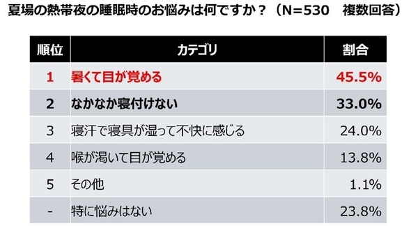 お悩みの1位は「暑くて目が覚める」(45.5%)、2位は「なかなか寝付けない」(33.0%)