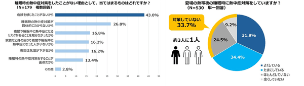 熱帯夜の影響で多くの人が軽度なものを含めた熱中症を発症していた可能性があることを受けて、熱帯夜に熱中症対策を行っているかどうかを確認すると、今回の調査では約3人に1人(33.7%)が「対策をしていない」と回答しました。