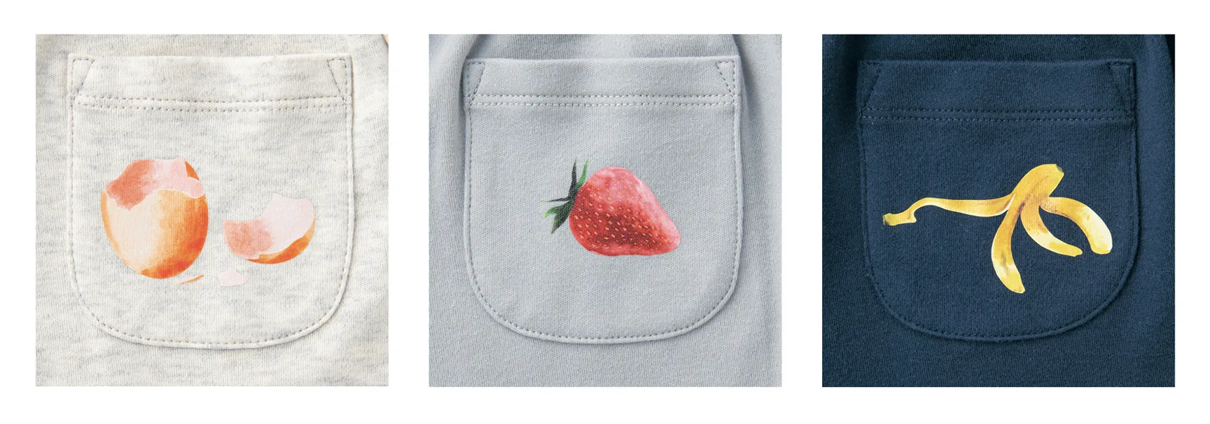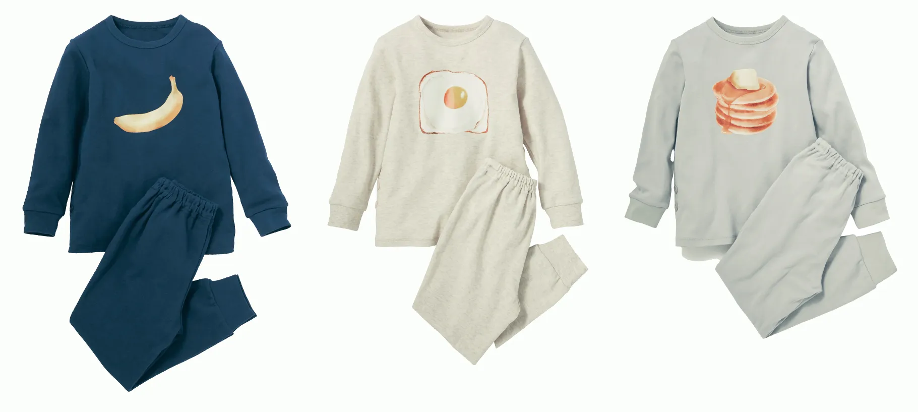 朝食パジャマは、子どもがぱっと起きて機嫌よく朝ごはんが食べられるように、そして朝が忙しいママもニコニコ過ごせるようにという思いから誕生しました。胸元には、朝ごはんが楽しみになるよう、バナナ・目玉焼きトースト・パンケーキの本物そっくりで美味しそうなイラストをプリント。そして、おしりのポケットには可愛いおまけイラストをプリントしました。